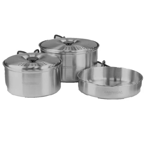 The Campingaz Camping Kit includes 2 saucepans with draining lids (18cm & 16cm), a 17cm frying pan with folding easy-grip handles . Its high-quality and durable stainless steel surface ensures efficient cooking. All items also nestle together for easy storage.