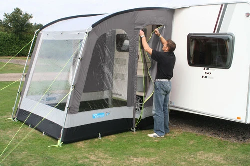 As with its larger siblings, the Dometic Rally 200 has a hybrid Aluminium upright poles to save weight and Dynaflex frame that makes it very easy to set up and maximises the use of the interior space and the adjustable front legs, with the latest adjusting clamp, ensure the awning fits snugly against the caravan.