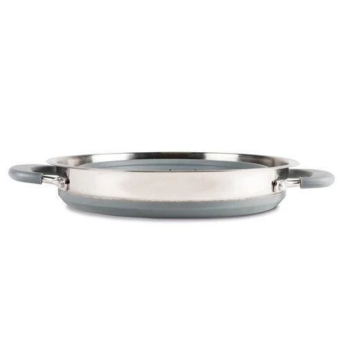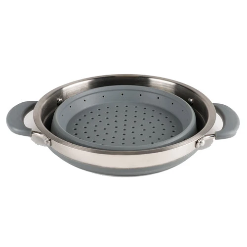This colander from Kampa uses stainless steel and silicone and fits inside the 1.5llitre and 3 litre folding pans that we have available and can also be used as a steamer with these pans (make sure the pan does not boil dry)