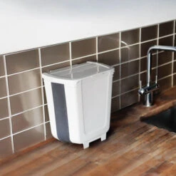 This highly versatile collapsible hanging bin can be used in caravans, motorhomes, kitchens, bathrooms, and offices. This collapsible hanging bin is a handy way to store food waste in the kitchen without bending down.