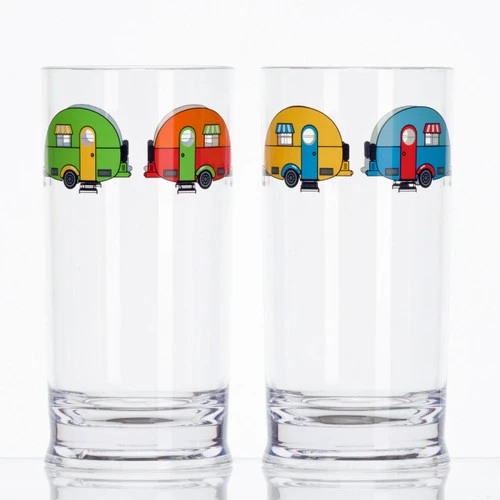 A pair of hiball glasses perfect for those long cool drinks in your caravan awning or even inside with a lovely caravan image w