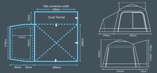 Various roof ventilation points aid in maintaining a comfortable internal temperature and pleasant flow of air within the awning, reducing humidity and condensation in hotter weather. The addition of twin piping enables compatibility with both caravans and motorhomes within the corresponding height range. Expansive PVC windows permit an excellent, crystal-clear vista of the outside world, whilst illuminating the interior throughout the daytime, allowing you to encapsulate the great outdoors from within the awning throughout poorer weather conditions, these are accompanied by clip-in curtains for complete privacy at night.