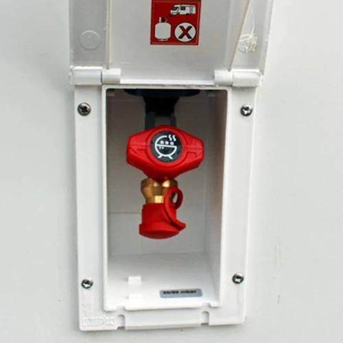 Designed for use with external gas points on caravans and motor homes similar to the one shown in the second photograph.
