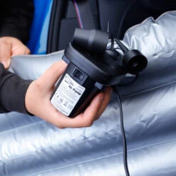 It comes with two inflatable pillows and an inflatable support base which goes into your vehicle’s foot wells as well as a pump which is powered through your vehicle’s 12V socket, a repair kit and a carry bag.