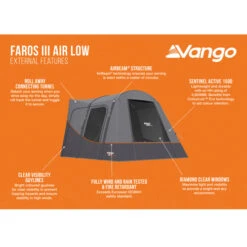 The Faros III Air Low is perfect for extra storage space or an additional seating area. It’s lightweight and compact design make it Vango’s smallest awning, taking up little room when packed away. Utilising Vango’s AirBeam technology and Sentinel Active 150D fabric, it is quick and easy to pitch while being light, durable and waterproof.