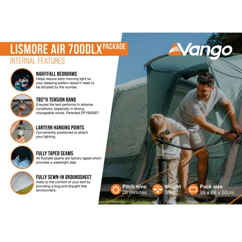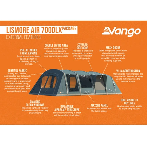 The Lismore Air 700DLX, is a 7-man inflatable AirBeam® tent ideal for longer family camping holidays. New for 2023, it comes with an additional groundsheet protector, which will protect and extend the life of your groundsheet and tent. The integrated front awning provides additional living space, while the Villa Construction maximises the usable indoor space and provides excellent height. The large, integrated awning and extra-large living area offer ample room for dining, socialising or relaxing.