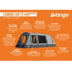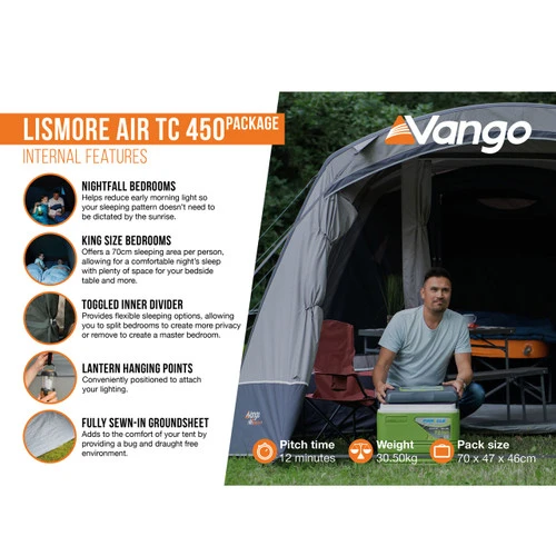 The Lismore Air TC 450 is perfect for long summer breaks with added luxury. This 4-man inflatable tent is designed with our AirBeam® technology, ensuring quick inflation, a sturdy and reliable structure. Featuring Sentinel TC fabric, the Technical Cotton fabric delivers enhanced climate control through superb breathability and has a soft handle for a premium experience. New for 2023, includes an additional groundsheet protector, which will protect and extend the life of your groundsheet and tent. The large living area and pre-attached front extension provide room for all the family. Furthermore, the King size bedrooms with Nightfall inners reduces early morning light, allowing for a peaceful night’s rest. Other features include cable entry points, a fully sewn-in groundsheet, and Diamond Clear windows for added comfort.