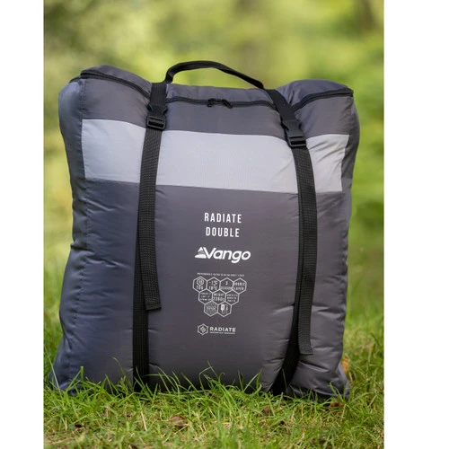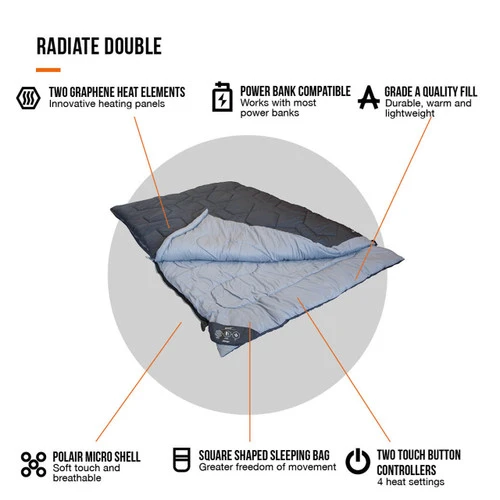 The innovative Radiate Double sleeping bag is new for 2021 and is sure to keep you warm when sleeping under the stars. Not only is this a deluxe 3-season, 10 tog sleeping bag, it also features two built-in Graphene heating elements, allowing you to top up the heat in your sleeping bag when connected to a power source. With twin touch button controllers, this bag offers the perfect solution for those who want that extra warmth. Compatible with any power bank, the Radiate sleeping bag will add a touch of luxury to your camping kit, with its high-quality fabrics and fills and integrated head rest. Ideal for use in spring through to autumn and you will be the envy of other campers.