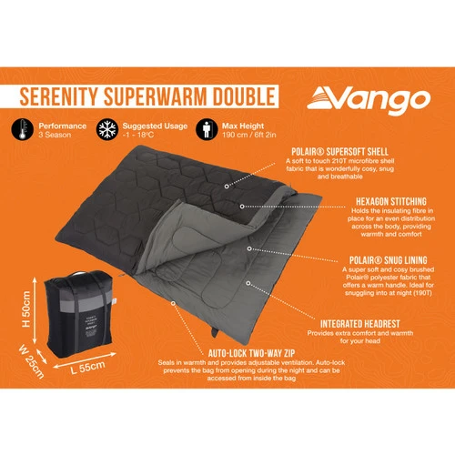 The stylish Vango Serenity Superwarm Double sleeping bag provides outstanding performance along with incredible comfort. This is a 3-season bag with a tog rating of 10, making it the perfect sleeping bag for camping from Spring through to Autumn. This square-shaped bag offers double-layer insulation for extra comfort and warmth as well as a soft-touch lining, giving that home-from-home feel for your outdoor haven.