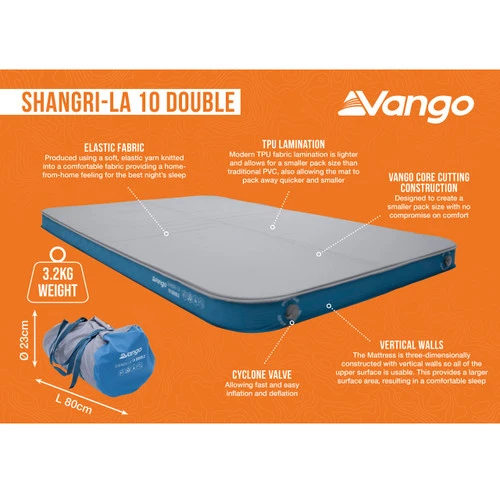 The Shangri-La II 10 Double is the pinnacle of Vango’s self-inflating mat collection. Featuring our unique core cutting construction to create a smaller pack size without compromising on the incredible comfort and a newly designed carry bag for easy packing and transportation. The vertical walls of the mattress provide a flat and level top to the bed and super-soft stretch fabric ensures a plush sleep surface, making the Shangri-La the ultimate in camping mattress technology and comfort.
