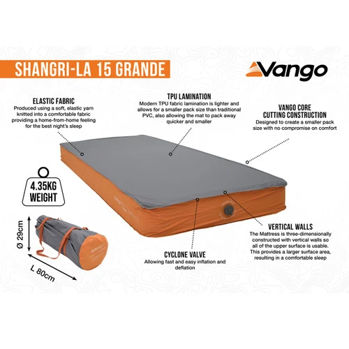 The Vango Shangri-La II 15 Grande sleeping mat is the pinnacle of Vango’s self-inflating mat collection. It features our unique core cutting construction to create a smaller pack size without compromising on the incredible comfort and a newly designed carry bag for easy packing and transportation. The vertical walls of the mattress provide a flat and level top to the bed and super-soft stretch fabric ensures a plush sleep surface, making the Shangri-La the ultimate in camping mattress technology and comfort.